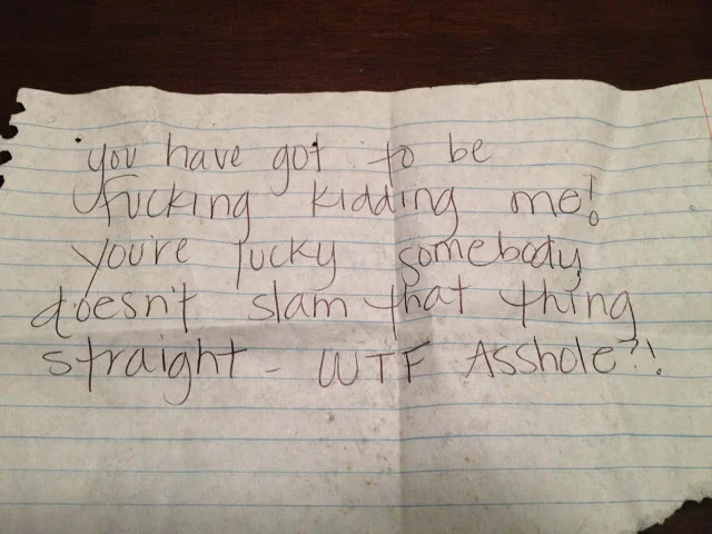 It made me laugh, but the content was a bit mystifying. When I got inside, the wife was standing outside the restaurant, saying we had just a short wait and her husband had gone to buy the movie tickets. I pulled out the note to get her assessment, and she immediately commented that perhaps someone had stuck it on a car windshield as a rebuke for bad parking.